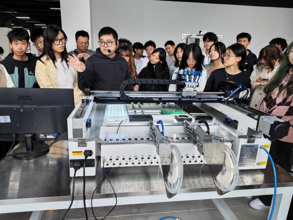 作为中国科技城(绵阳)重点高新技术企业,蝴蝶信息专注于工业自动化、智能装备研发与物联网系统集成,拥有集群网络通信系统、高速精密视觉贴片机等多项自主知识产权产品。在企业总经理王龙的带领下,师生依次走访了研发中心与生产车间,系统了解从工业设计、硬件开发到软件集成的全链条研发流程。在智能装备展示区,视觉贴片机以每分钟12000点的高速运行与0.02毫米的超高精度引发同学们阵阵惊叹。王龙指出:“技术创新必须回归实际问题。我们的贴片机通过AI算法优化,将传统设备良品率从98%提升至99.9%,这背后是数百次代码迭代与工程实验的积累。”